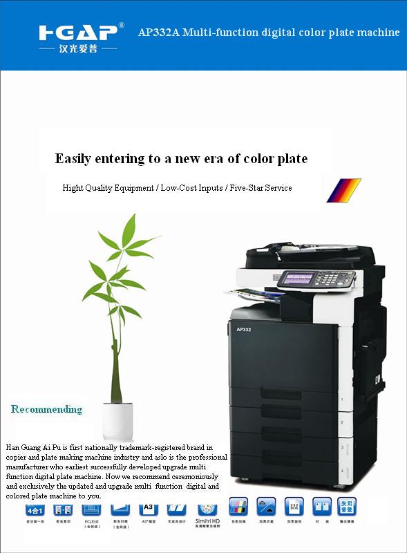 AP3320B multifunctional color plate machine can make your plain offset printer become into color one( electronically automatic color division, print red, blue, yellow, black, color plate) it cost you less than RMB10 to make 1 set of color plate by using 4-color machine or plain offset printer, meanwhile , it open up precedent of low cost but fast color printing.