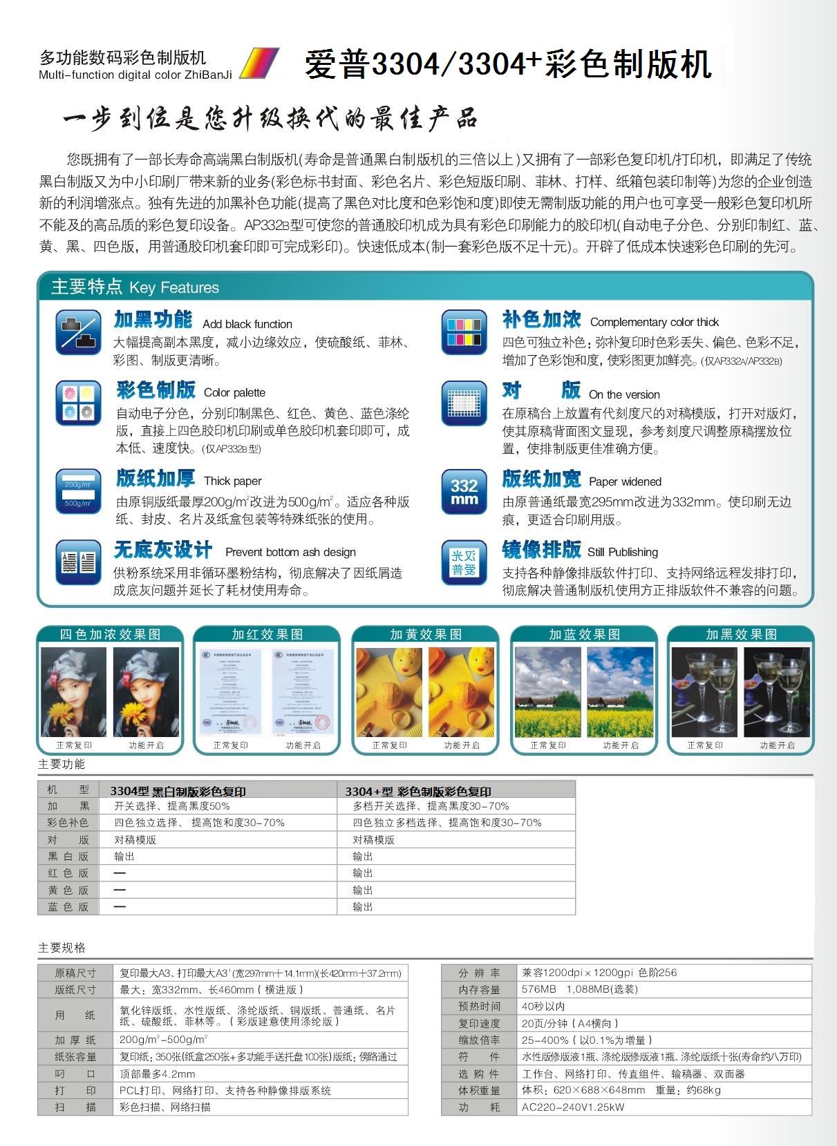 3、彩色制版:自动电子分色,分别印制黑色、红色、黄色、蓝色、涤纶版,直接上四色胶印机印刷或单色胶印机套印即可。(仅AP3304+型)